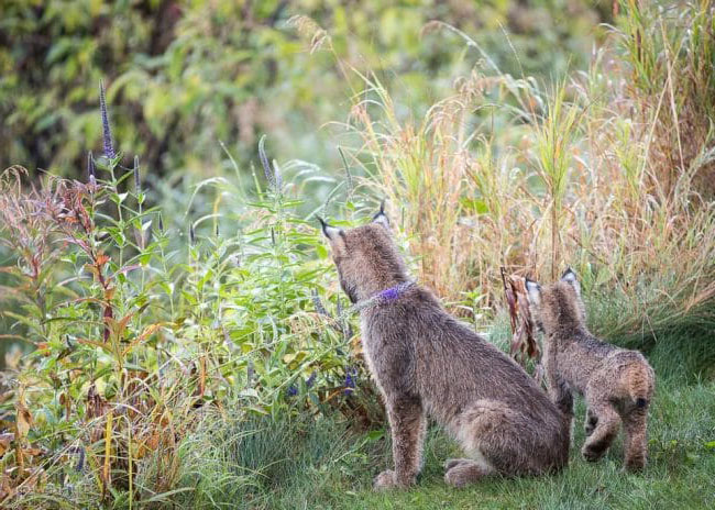 ▼後來猞猁媽媽在草地上叫了幾聲,猞猁寶寶們聽到後一隻接著一隻跑了過去,然後牠們一起回到了森林裡。