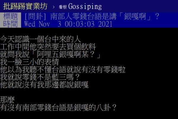 這位網友以「南部人零錢台語是講『銀嘎啊』?」為題發文,表示自己剛認識一位來自台中的同事,對方要買飲料時詢問自己「阿哩五銀嘎啊某?」,他聽得一頭霧水,對方見他沒反應,還以為他聽不懂台語,就問「有沒有零錢啦?」原po這才回說「零錢不是藍三嗎?」他好奇詢問大家:「有沒有南部零錢台語是銀嘎的八卦?」