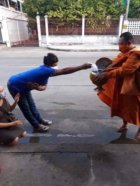 ▼泰國篤信佛教,路上或佛寺裡經常能看到師傅來化緣。但為了保持社交距離,給化緣品也要用長匙子。這是把福氣和健康都兼顧到了。