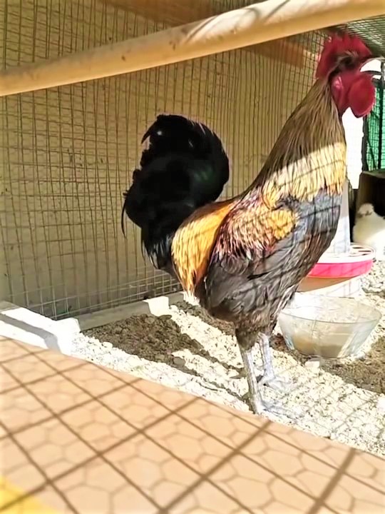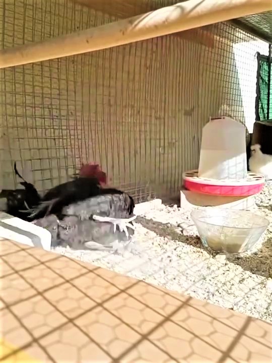 ▼只見Bahtiyar站在雞舍內,挺胸抬頭、開始發出叫聲。牠一口氣啼叫15秒鐘,胸部越挺越高,頭也高高仰起。最後牠忽然沒氣,因為缺氧直直倒下,不小心碰到籠子邊緣才醒過來。
