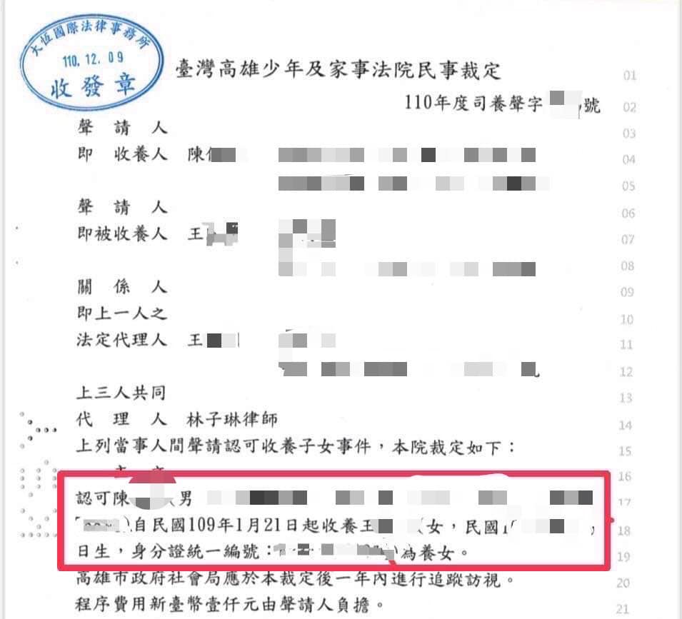 2022年01月05日高雄有一對男同志愛侶「喵喵」和「圍圍」。圍圍在婚前收養女嬰「肉肉」,但根據現行法令,他的配偶喵喵卻無法成為肉肉法律上的家人。無奈之下兩人提起訴訟,苦等將近3年,法院終於裁定許可喵喵的收養聲請,他們成為了全台第一個同志共同收養子女的家庭~