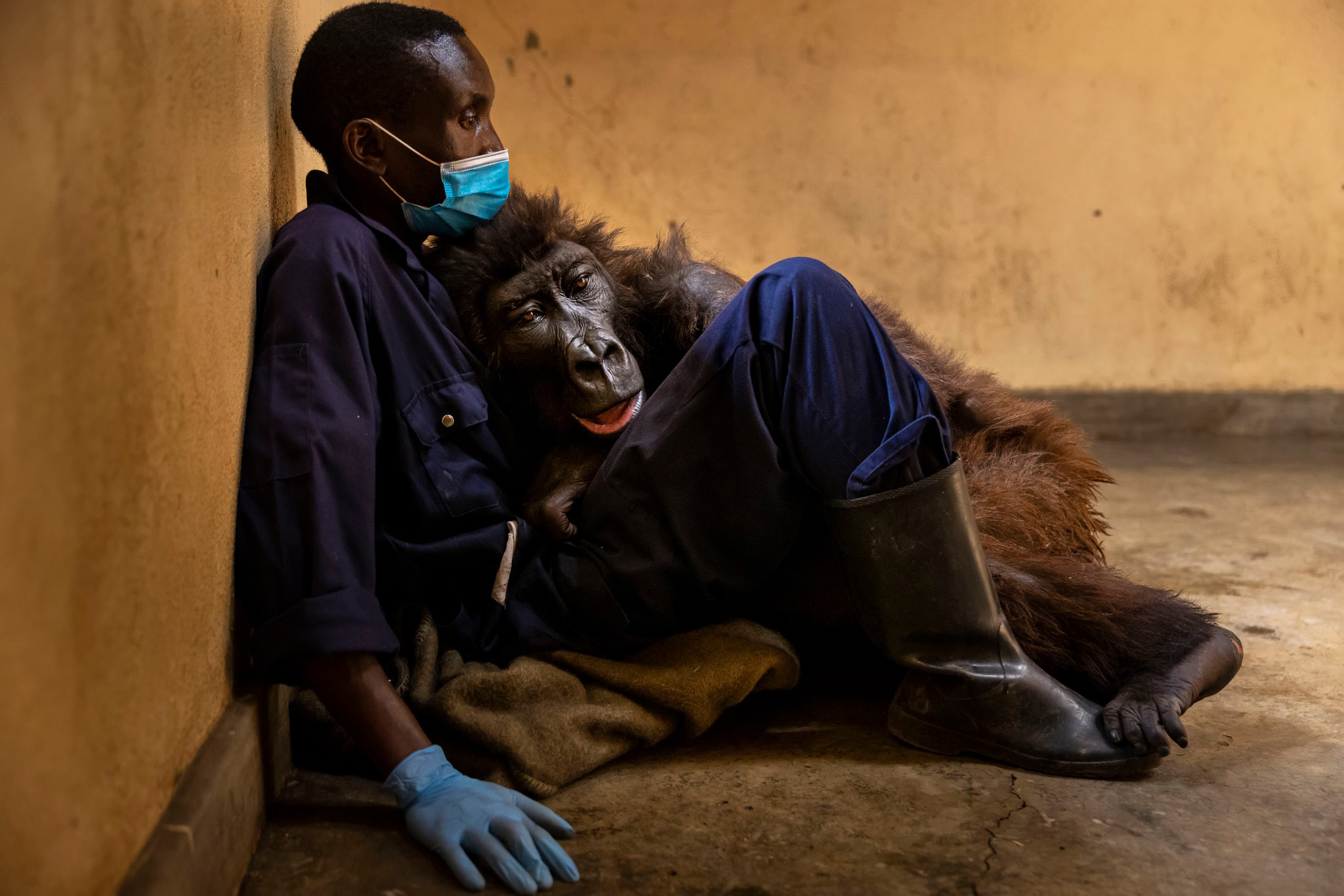 ▼失去媽媽,又被帶到新環境的Ndakasi非常驚恐,Andre用嬰兒抱的方式整夜把牠抱在懷裡。從此之後,Ndakasi把他當成了「代理孕母」,他們的感情非常好,幾乎到了形影不離的程度。