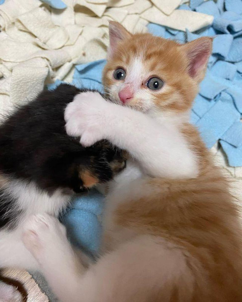 2022年01月13日不久前,有人在一條繁忙的道路旁發現了2隻小浪貓。牠們躲在灌木叢裡,身邊沒有母貓陪伴。救援人員趕到現場時,發現那是一隻小橘貓和一隻三花貓。路邊有一些好心人留下的食物,但貓咪們剛剛出生不久,還不能吃那些東西,牠們應該餓肚子很長時間了。