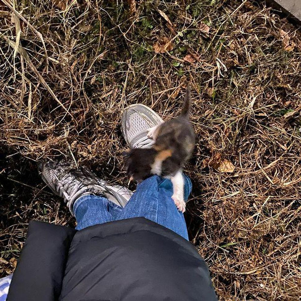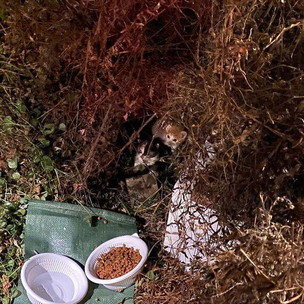 ▼救援人員剛剛走近,貓咪們就從灌木叢裡跳了出來。三花貓還努力想要爬上救援人員的腿,好像已經準備好跟他們離開了。救援人員等了一會兒,沒有看到母貓的蹤影,只好先帶著小貓們離開。