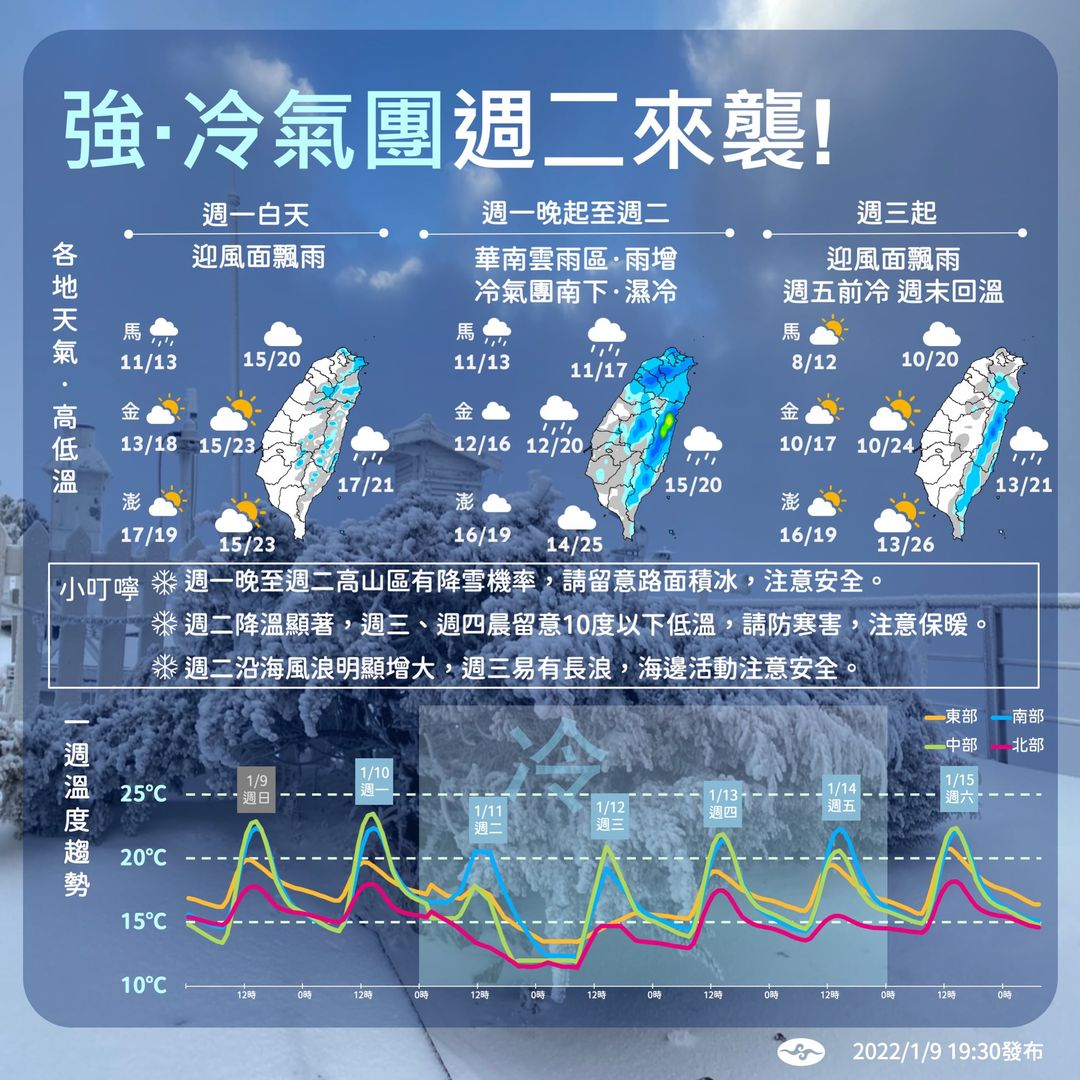 氣象局指出,今天東北季風減弱,白天高溫北部及宜花18到22度,中南部及台東約24到26度,中南部日夜溫差較大。週二會有強烈大陸冷氣團南下,氣溫將明顯下降,而且越晚越冷。最冷時段為週二深夜至週三清晨,屆時中部以北、東北部下探10到12度,南部12度,花東分別為14、15度。