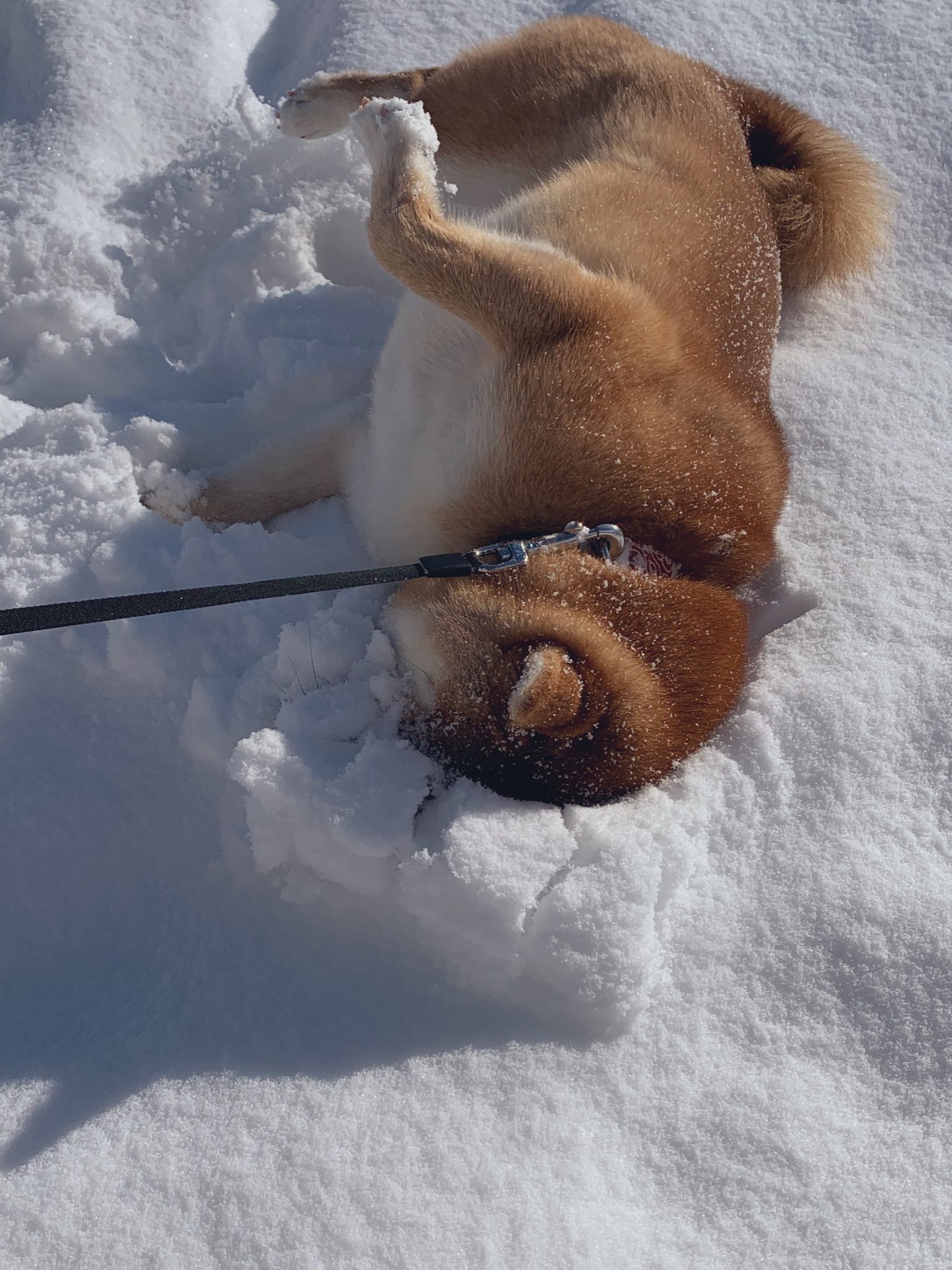 ▼春瑠將臉埋在雪中,躺在雪地上,手手有一下沒一下地刨雪。主人看得一頭霧水,牠到底是要剷雪,還是鑽進雪地裡?
