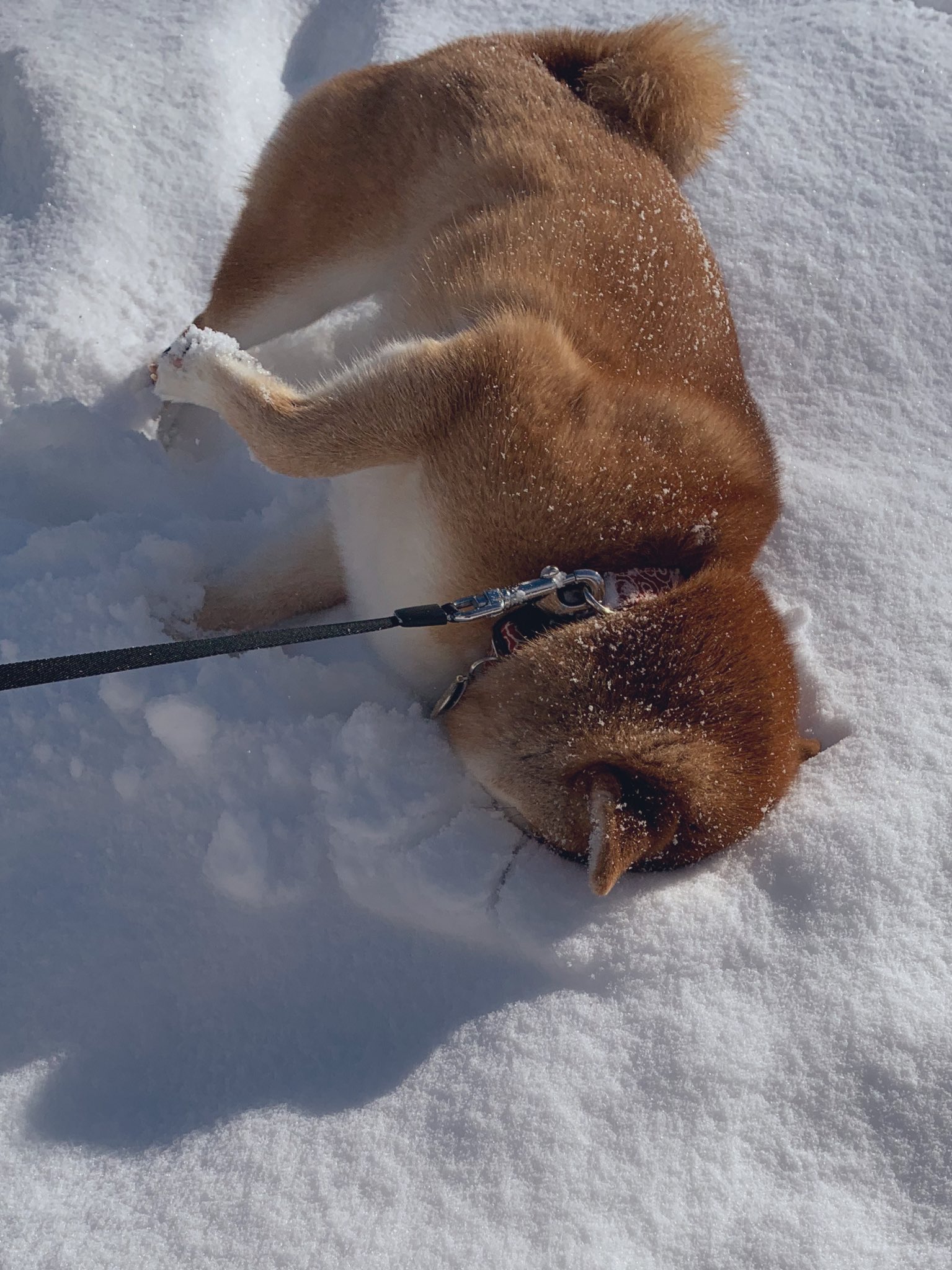 ▼春瑠身材壯碩,毛毛厚實,一點也不怕冷。主人帶牠在雪地裡走著走著,牠竟突然將臉鼻埋進了雪裡。接著牠開始用手手撥雪,好像要把自己全部埋進去一樣。