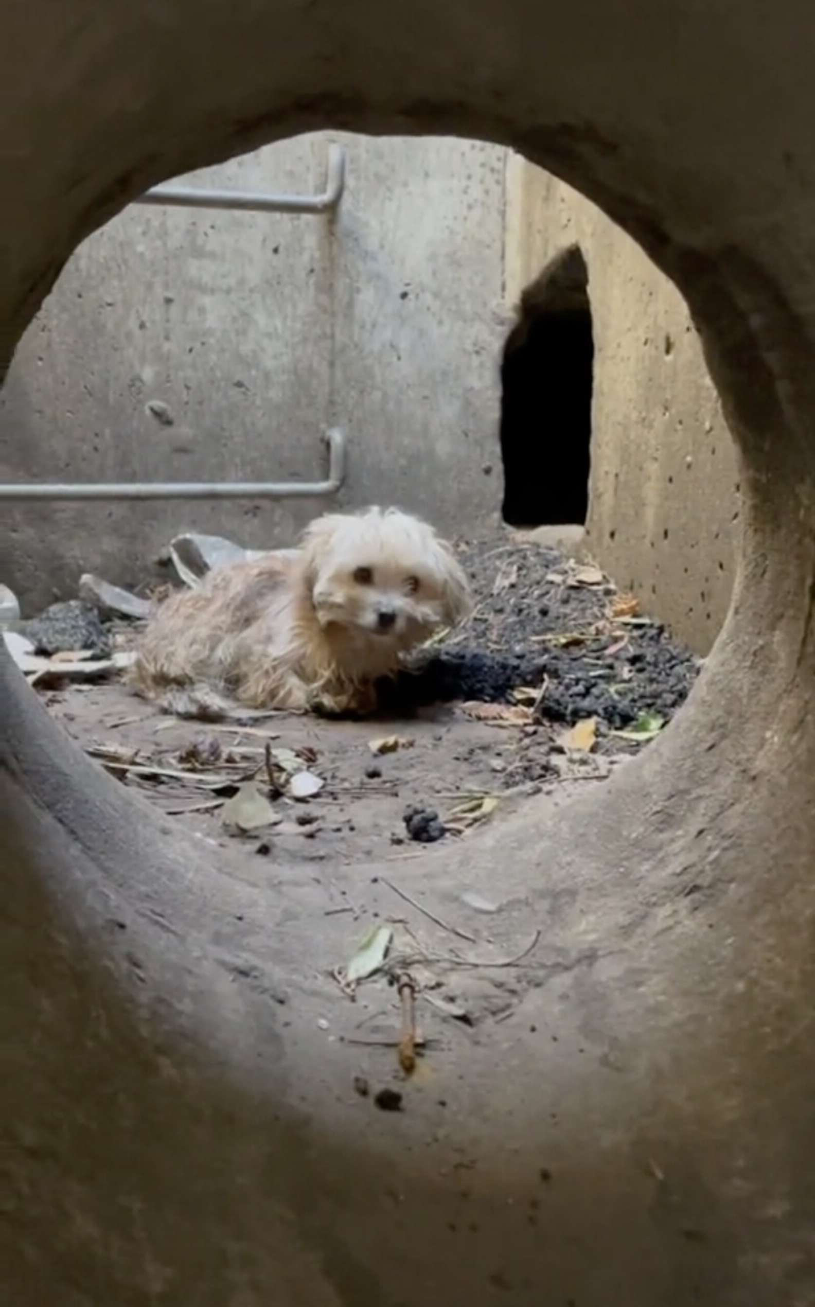 ▼Michael和團隊在河道邊探險時,先是被兩旁的有趣塗鴉吸引,一路慢慢欣賞時,突然看到了一個洞口。那隻小白狗就躲在裡面,牠蜷縮在最深處,趴在地上不敢動,也不敢出聲,看起來非常可憐。