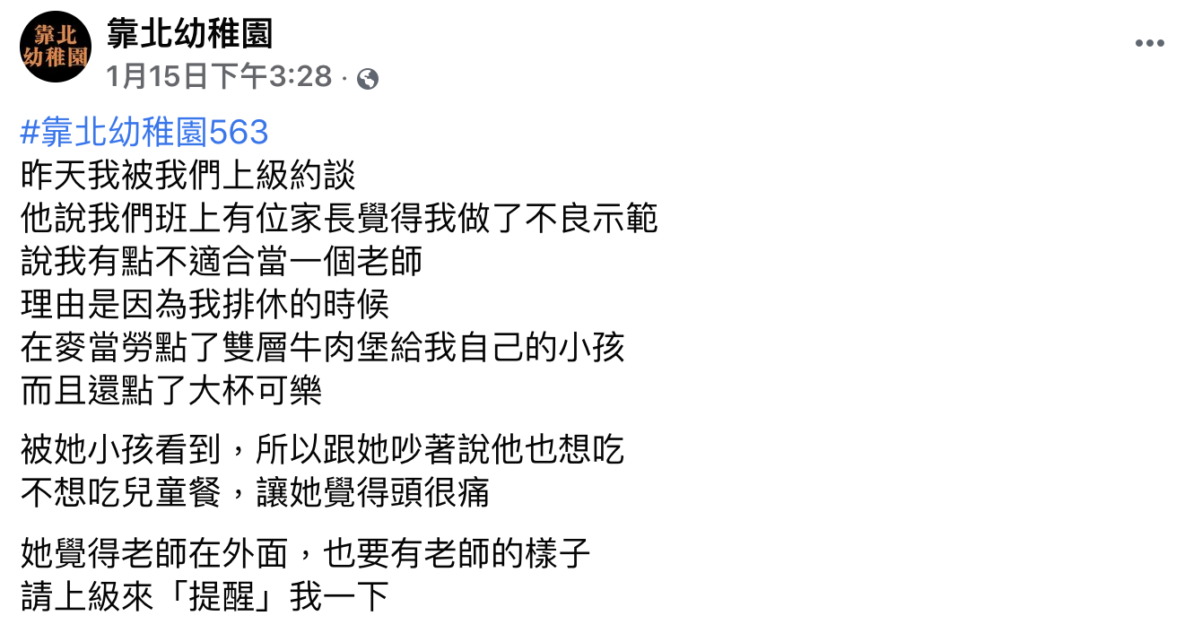 2023年06月23日只是吃個麥當勞也不行嗎?日前一位幼兒園老師在臉書社團「靠北幼兒園」po文說,她休假時帶著自己的小孩到麥當勞點了雙層牛肉堡和大杯可樂,沒想到竟然被學生家長投訴,認為她做不良示範、沒有老師的樣子。她跟那位家長聯絡,得知原因後大傻眼。