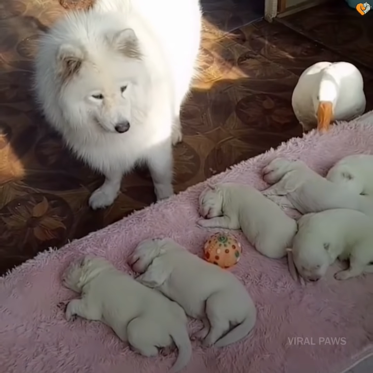 薩摩耶媽生6胞胎「顧到快起笑」 最強隊友「閨蜜鵝鵝」幫忙帶:我來妳去休息!
