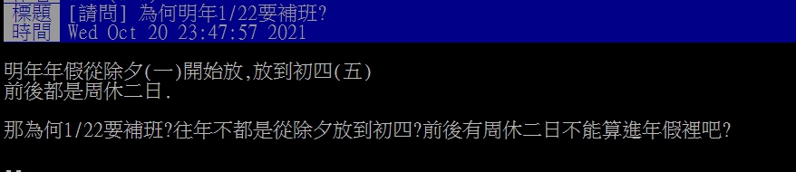 ▼日前一名網友在PTT以「為何1/22要補班?」為題發文,指出今年農曆春節年假從除夕(1/31)放到初四(2/4)。這段日期的前後都是週休六日。原po非常疑惑,往年放假都是從除夕放到初四,「前後有週休六日不能算進年假裡吧?」為什麼今年1月22日還要補班呢?