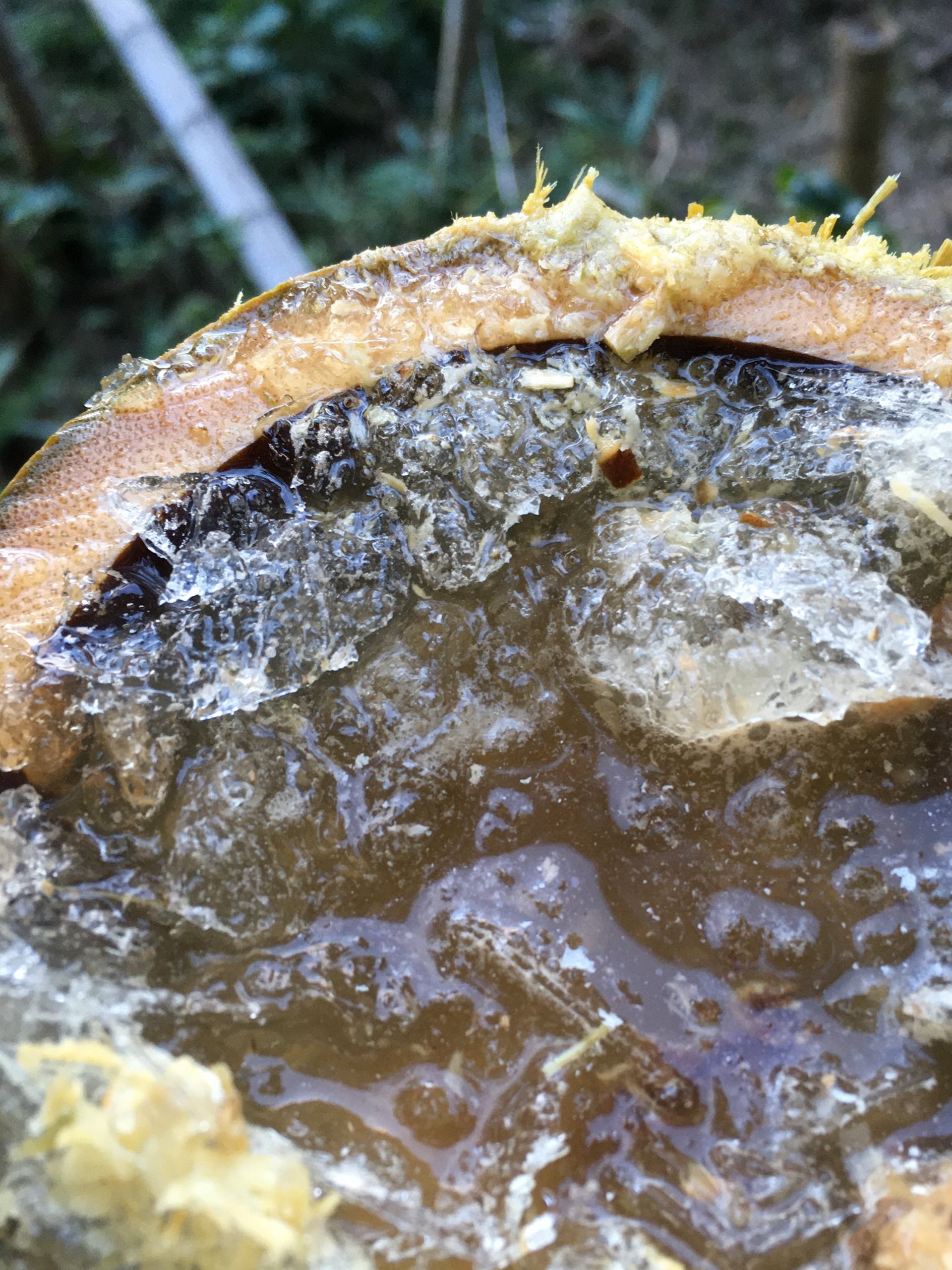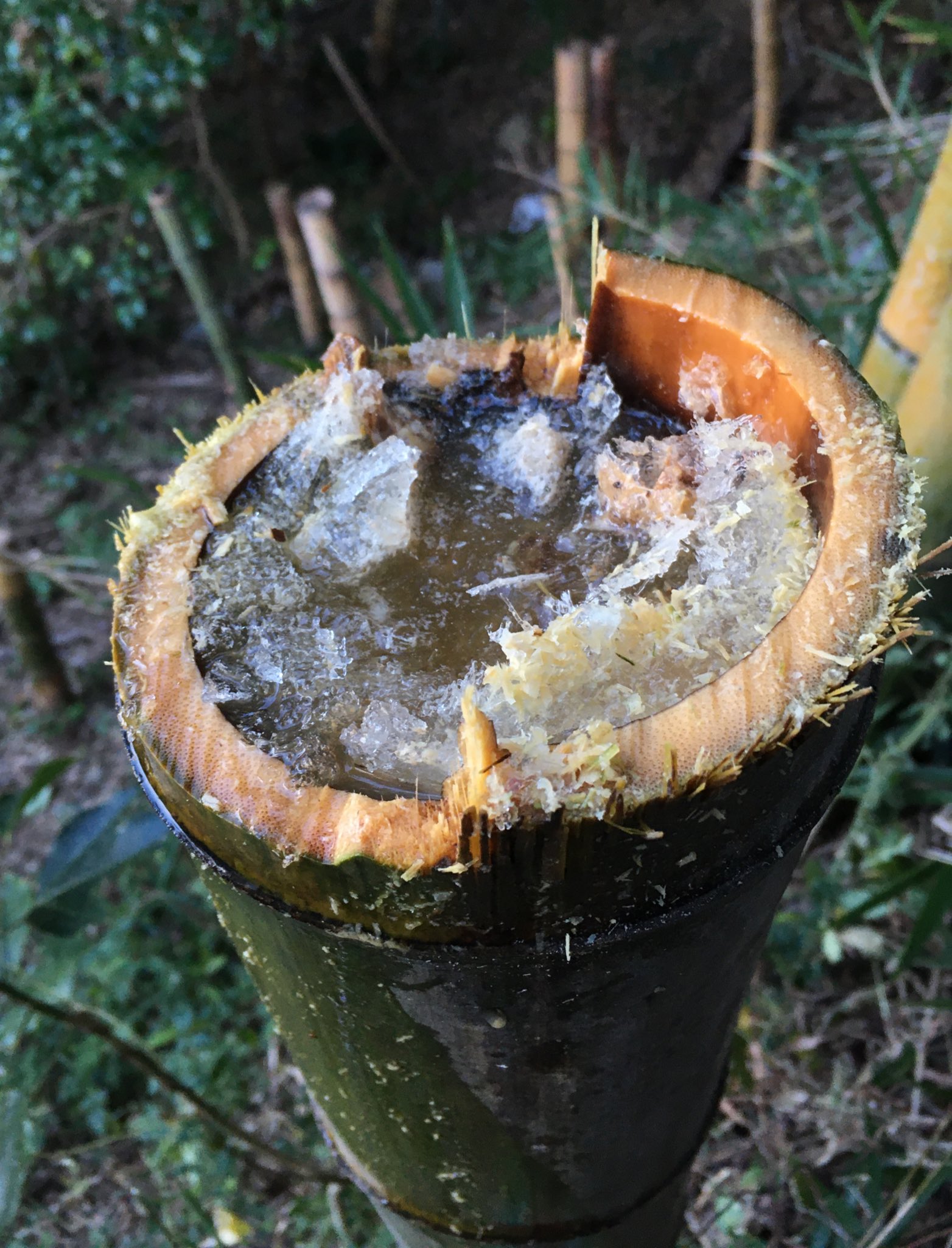 冬天是砍竹的好季節,如果運氣好的話,可能發現竹子裡蘊藏著的寶藏!日本推主@sawagani550cc分享自己砍伐竹子時的經歷,鋸子下去後,竹筒裡竟然噴出大量的水,而且還瀰漫著甜甜的酒香。原來這是竹竿裏面累積的糖液發酵成的酒精,其中一部分因為氣溫低變成了冰沙狀,是一種天然的美味。