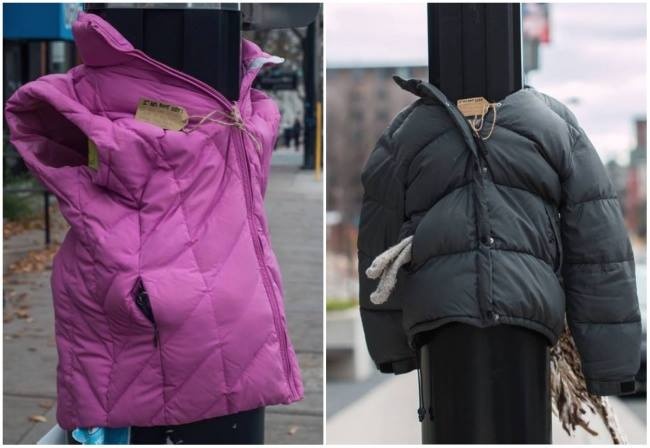 ▼在加拿大,他們會用不打擾且令對方保有尊嚴的方式,去關懷那些需要幫助的人。譬如天冷時,在柱子上放置外套、手套等禦寒衣物,並附上紙條寫著:「如果你/妳有需要,請儘管取用吧!」
