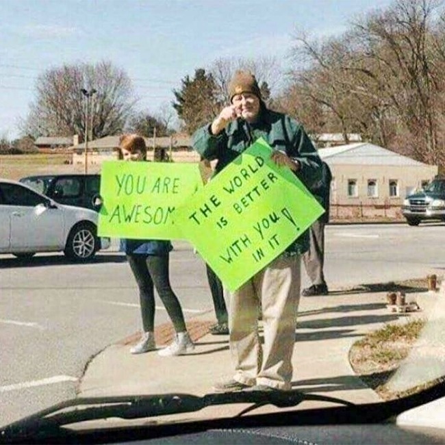 ▼加拿大居民的休閒活動之一:「舉著充滿勵志性標語的海報,在街頭為路過的陌生人車加油打氣!」(正能量爆棚)