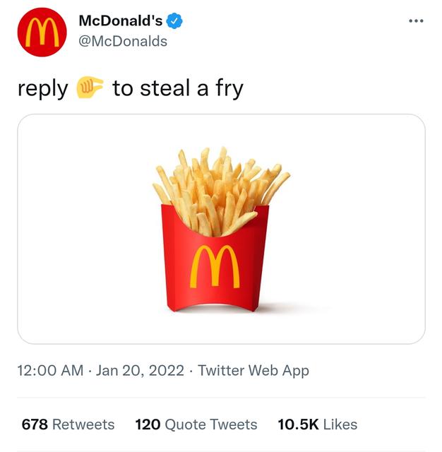 ▼這件事的起因,是麥當勞在推特上po出一張薯條圖片,並在標題用一個捏手指的表情,告訴大家「留這個圖片,你就能得到一根薯條」。很多藍勾勾帳號現身互動,Xbox也來拿一根薯條。