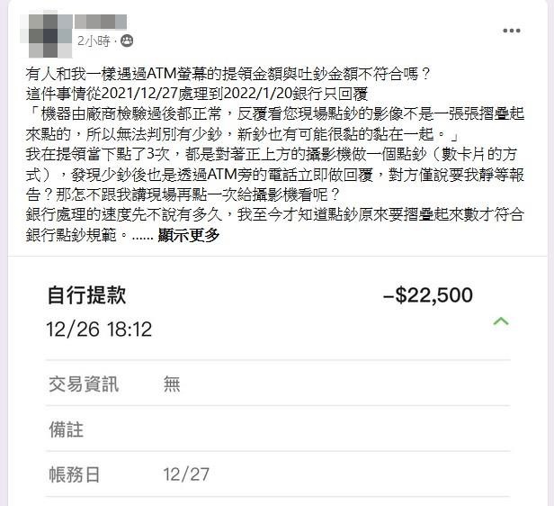 2022年01月24日很多人習慣在ATM上提款領錢,如果發現機器少吐錢,該怎麼做呢?日前一名網友在臉書社團「爆料公社」發文,分享了自己的經歷。他在ATM上領錢時發現金額有少,立刻撥打一旁的緊急電話詢問,同時還對著監視器數鈔證明,回報給專員。沒想到對方看完畫面,卻說他「少了一個動作」,只能自行吸收遺失的1千元損失。