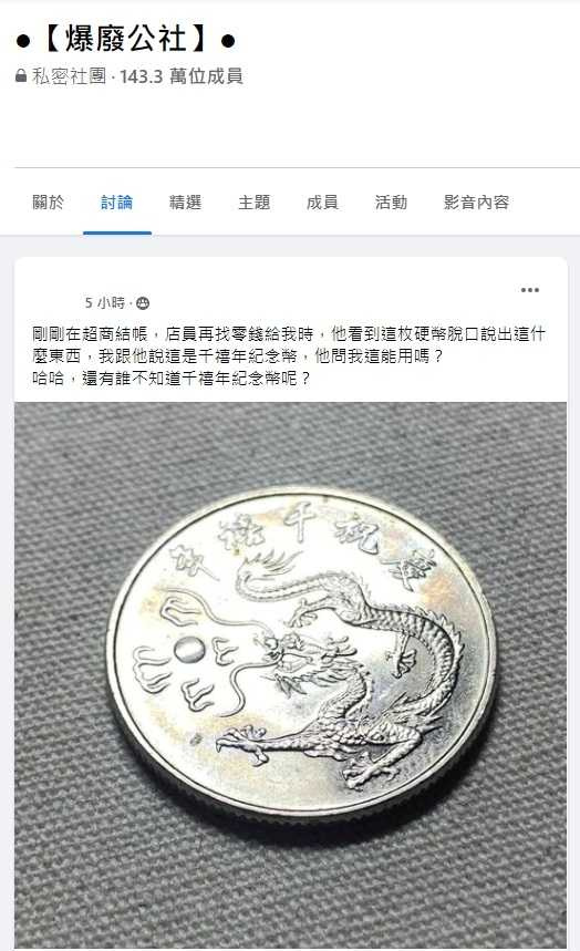2022年01月25日這枚10元硬幣的外型好奇特~日前一名網友在臉書社團「爆廢公社」發文說,在超商結帳時,店員給了他一枚外型奇特的10元硬幣,而硬幣正面的圖案是一個龍,還寫著「慶祝千禧年」的字樣。很多內行的網友看到後紛紛驚呼「賺到了」~
