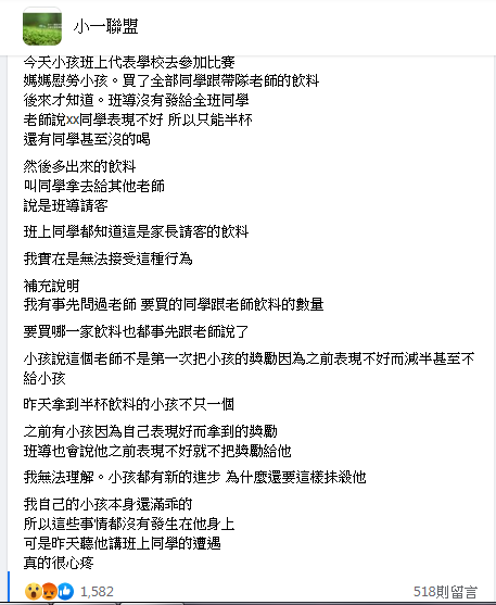 原po表示,她買飲料是為了慰勞參加比賽的孩子們和帶隊老師,結果班導沒有把飲料發給全班同學,還說「某某同學表現不好,所以只能喝半杯,還有同學甚至沒得喝」。多出來的飲料班導另有安排,「多出來的飲料,叫同學拿去給其他老師,說是班導請客」。