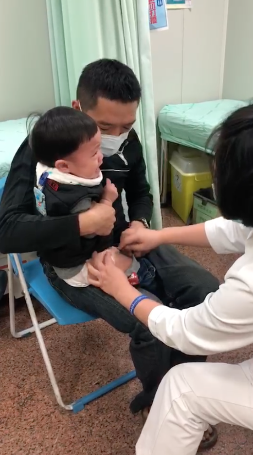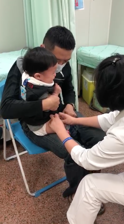 ▼護士阿姨則耐心指導著林爸爸抓緊孩子的脚,然後很熟練地快速在Chris腿上打一針,讓他趕快熬過這個時刻。