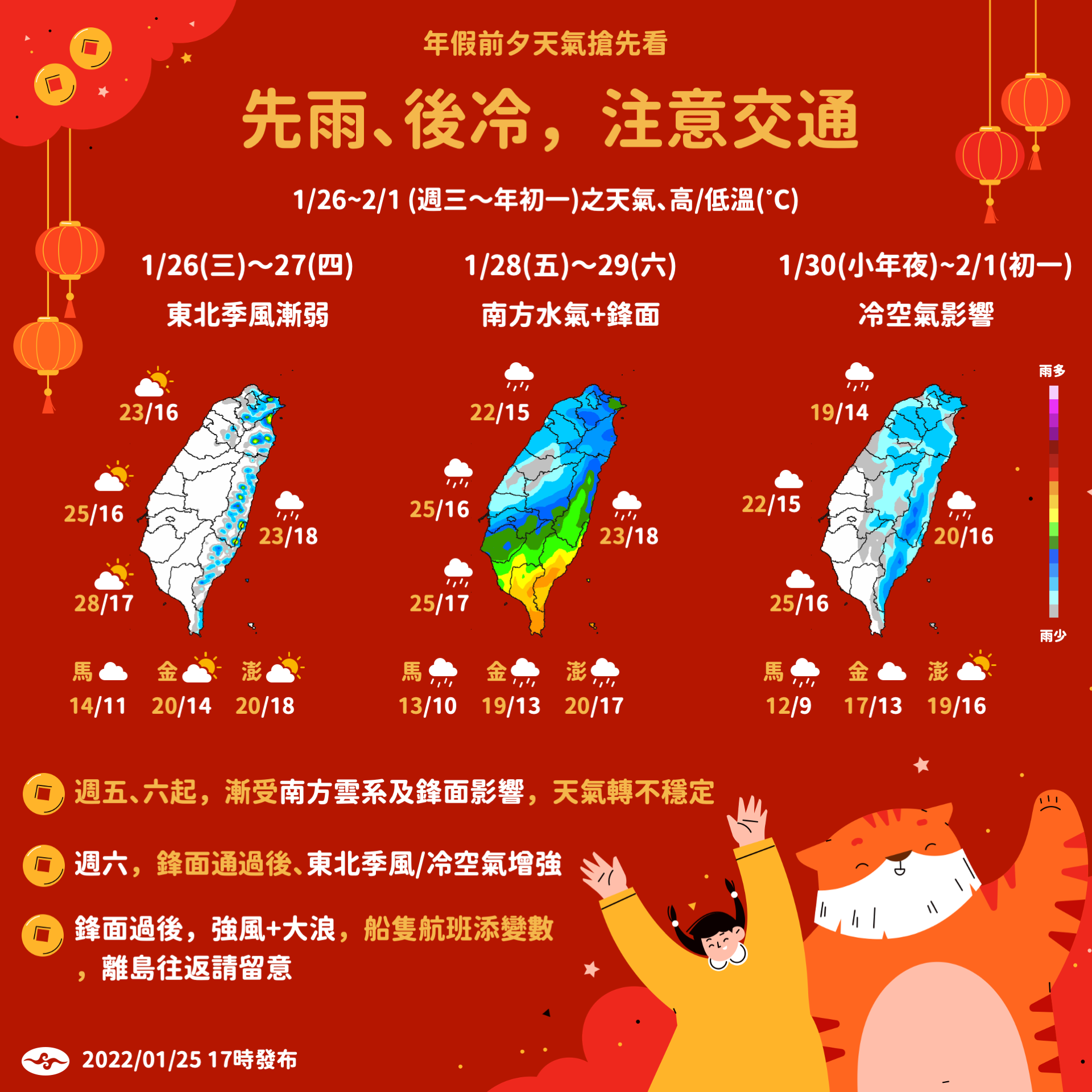 2022年01月26日今、明兩天(26、27日)東北季風逐漸減弱,北部及東北部氣溫回升,最高可來到28度,多地區能見到陽光。但好天氣轉瞬即逝!週六(29日)及下週三(2/2日)晚間分別有鋒面南下,每一波鋒面都會帶來2到3天的降雨。氣象專家吳德榮表示:「春節連假大致是晴雨參半的天氣。」