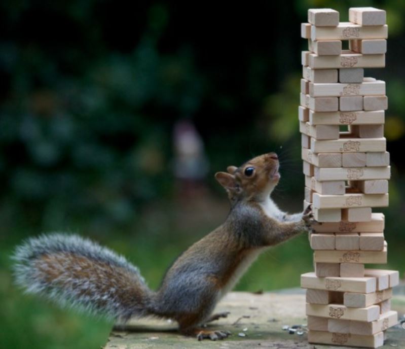 ▼Max表示,他發現松鼠很喜歡玩桌子上的小道具,尤其是放在食物附近的東西更受歡迎。於是他把道具埋在花生醬、葵花籽下面,吸引松鼠過來玩。