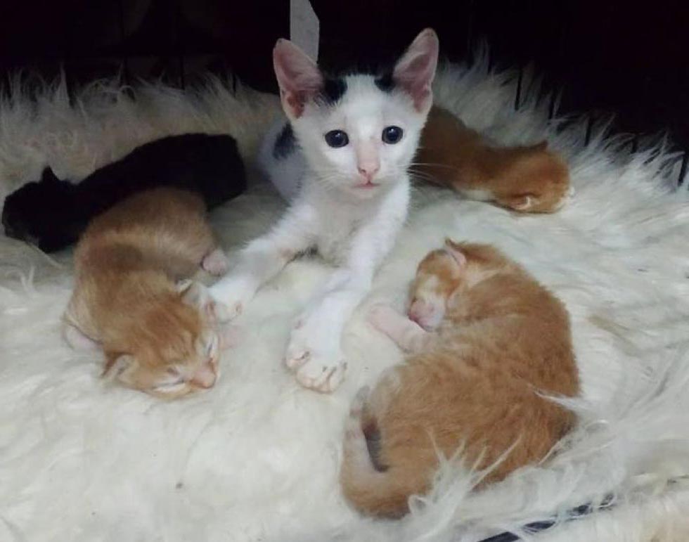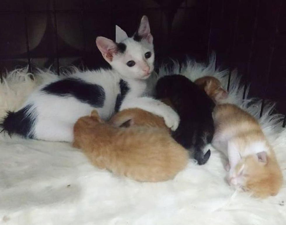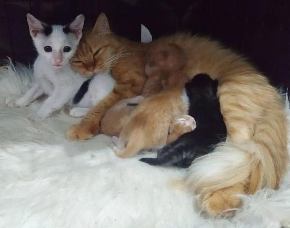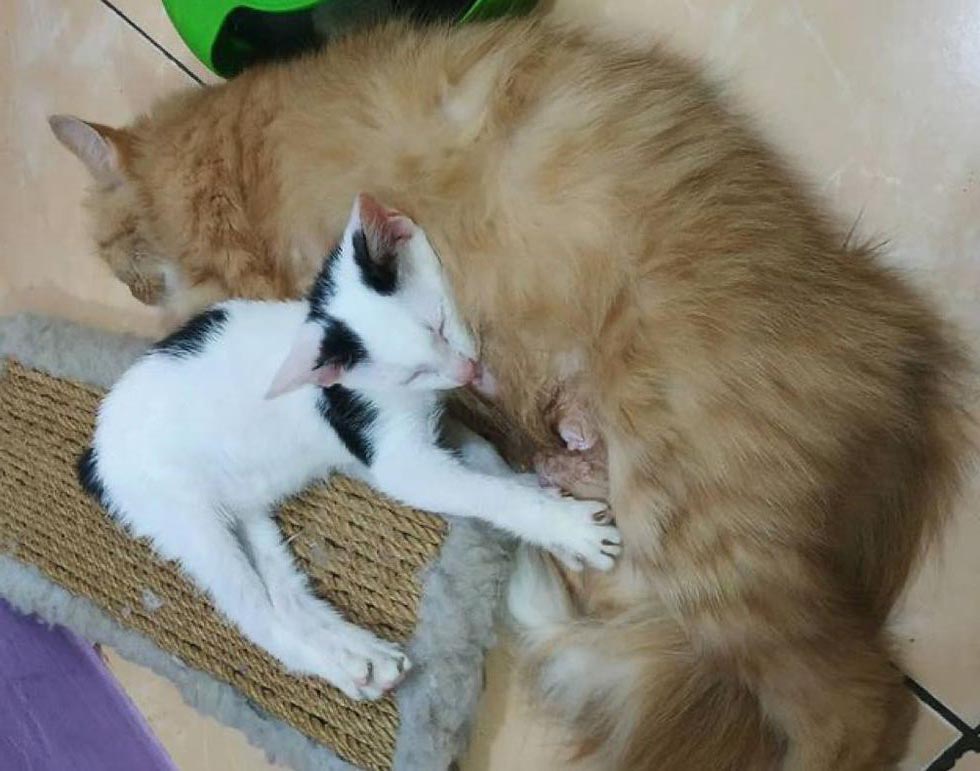 ▼雖然Bella家中有跟Daniboi同齡的貓咪,但牠還是堅持待在貓媽媽和小貓們身邊。貓媽媽很快就接納了牠,還主動幫牠舔毛。