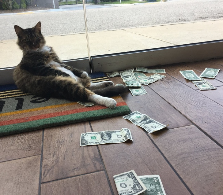 ▼原來這間辦公室位於繁華的地段,每天有很多人從門口經過。路人隔著玻璃門看到CASHnip,就將鈔票塞進門縫逗牠玩,結果貓咪一下子就把鈔票搶走了。久而久之,經常有人故意拿鈔票來逗CASHnip。