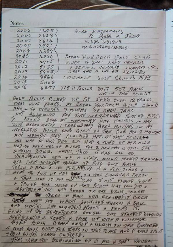 ▼蓋爾會把潔西撿球的數量記在筆記本上,潔西在撿球上天賦異稟,這讓蓋爾很自豪,牠會比同樣會撿球的狗狗撿的多很多,至今已撿了5萬多顆球,也為蓋爾省了一大筆的錢,他再也不用去買球了,而且家裡的球多到送朋友、慈善商店都送不完。最後連商店也收不下了,只能拒收。