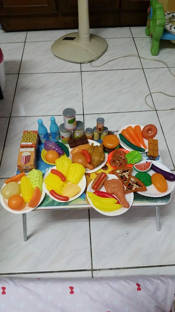 ▼網友指出女兒常看到阿嬤拜拜,有天也有樣學樣拜起地基主,只見她以玩具桌為基座,在上面擺上熟食、蔬食、飲料和罐頭塔,根本是普渡等級,其他人更眼尖發現她有拿支「雞腿」作供品,直呼這真的好專業!