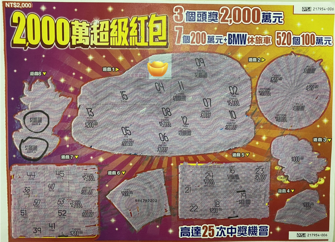 ▼除了這位單親媽媽,還有不少人幸運中獎。新北、桃園也有民眾刮中「2000萬超級紅包」三獎100萬,中獎的分別是一位40多歲和一位50歲的男子。那位40歲的男子表示,他平常天天都會購買今彩539,最近財運很旺,同一張今彩539中了2注二獎。他想趁運勢旺刮個大獎,最希望能刮中今年「2000萬超級紅包」二獎的BMW休旅車。到投注站後,他一次買了2本「2,000萬超級紅包」刮刮樂。