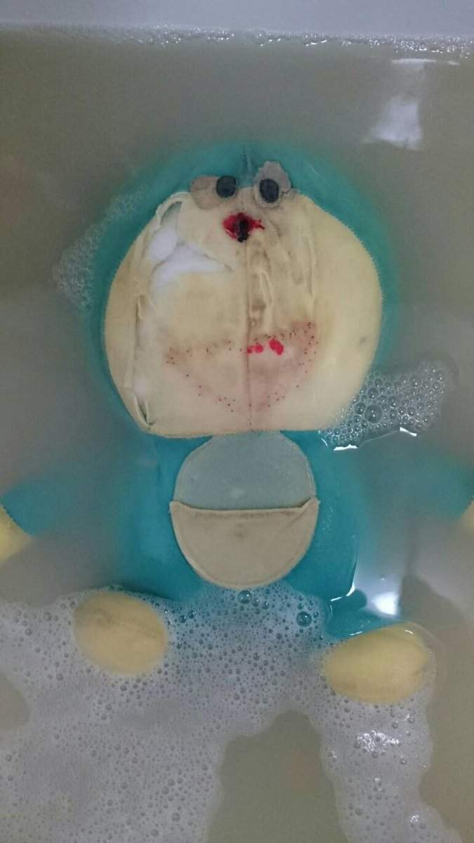 ▼修復之前先幫哆啦A夢洗個澡,泡了一下後,娃娃乾淨了不少。
