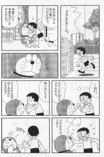 ▼漫畫中,大雄向哆啦A夢要道具,但哆啦A夢就像沒聽見一樣,反而一動不動。大雄本以為哆啦A夢故意不理他,後來才知道它沒電了。如果直接更換電池的話,哆啦A夢會失憶,徹底忘記大雄,這讓大雄很苦惱。