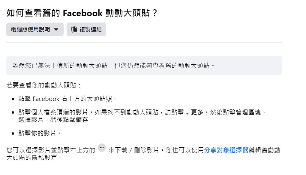 ▼臉書的使用說明中也提到:「已無法上傳新的動動大頭貼,但用戶仍然能夠查看舊的動動大頭貼。」如果用戶要查看之前的動動大頭貼,可以點擊右上方的大頭貼,到個人檔案頂端的影片查看;如果找不到可以到個人檔案的更多選項,點選管理區塊內的影片查看。