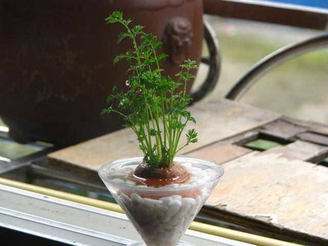 ▼「胡蘿蔔」雖然無法種出胡蘿蔔,但胡蘿蔔葉拿來欣賞也很不錯!將胡蘿蔔頭洗淨後放入杯中,加水蓋過胡蘿蔔二分之一的高度,放在靠窗的地方,很快就長出漂亮的葉子啦!