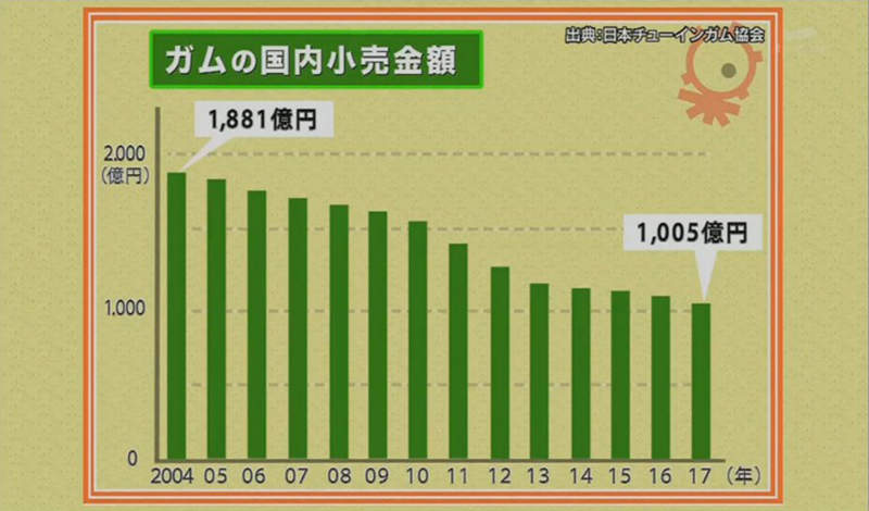 ▼根據調查,日本泡泡糖(口香糖)市場規模不斷縮小,銷售額也呈現逐年下降的趨勢。