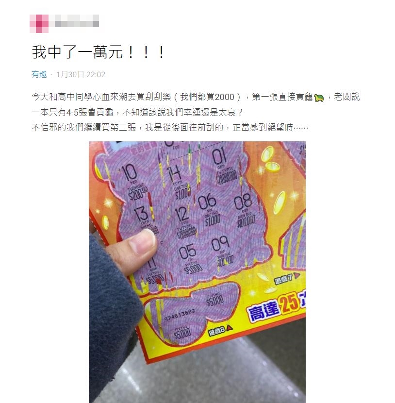 這名女大生表示,她和高中同學心血來潮去買刮刮樂,她第一張先買2000元品項的刮刮樂,結果直接「貢龜」。彩券行老闆笑說「一本只有4至5張會槓龜」,讓她不知道自己太幸運還是太衰?接著她又買了一張2000元刮刮樂,直接爽中5000元。