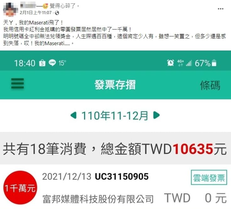 2022年02月08日統一發票每隔兩個月開獎,每次都有不少人運氣好中獎,但也有人與獎金擦肩而過。日前一名女網友在臉書表示,她查詢近一期雲端發票App時,發現自己網購中了千萬元,但最終因為支付方式與獎金擦身而過。這讓她遺憾直呼:「我的瑪莎拉蒂飛了!」