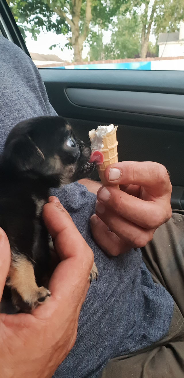 2022年02月14日日前愛爾蘭一名網友經過一處草叢時,突然聽到了幾聲微弱的狗叫。他連忙過去查看,這才發現有一隻剛剛出生不到5週的巴哥犬被裝在塑膠袋裡拋棄了。牠已經餓了好久,瘦得皮包骨,全身都是跳蚤,還有一隻腳受傷了。網友連忙將牠送到動物救援中心「Coolronan Dog Rescue」接受治療。