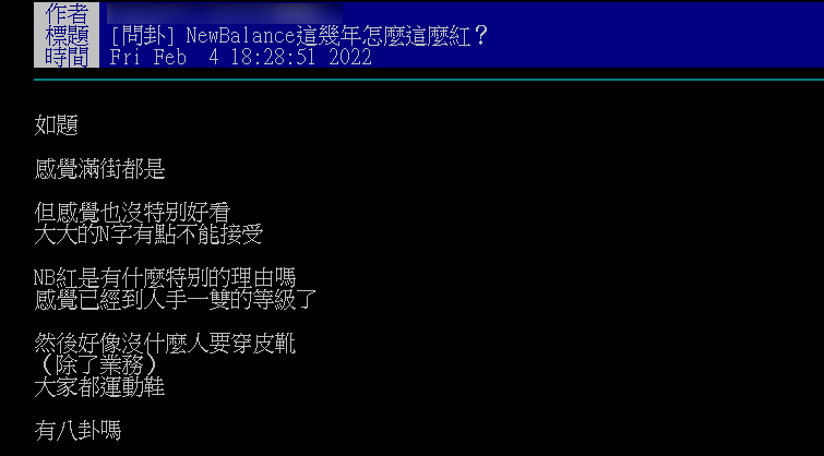 ▼一名網友在PTT以「New Balance這幾年怎麼這麼紅?」為題發文,表示走在街上感覺滿街都是這牌子的鞋。原po認為也沒特別好看,大大的N字讓他不能接受,因此他詢問大家:「New Balance紅是有什麼特別的理由嗎?感覺已經到人手一雙的等級了。」