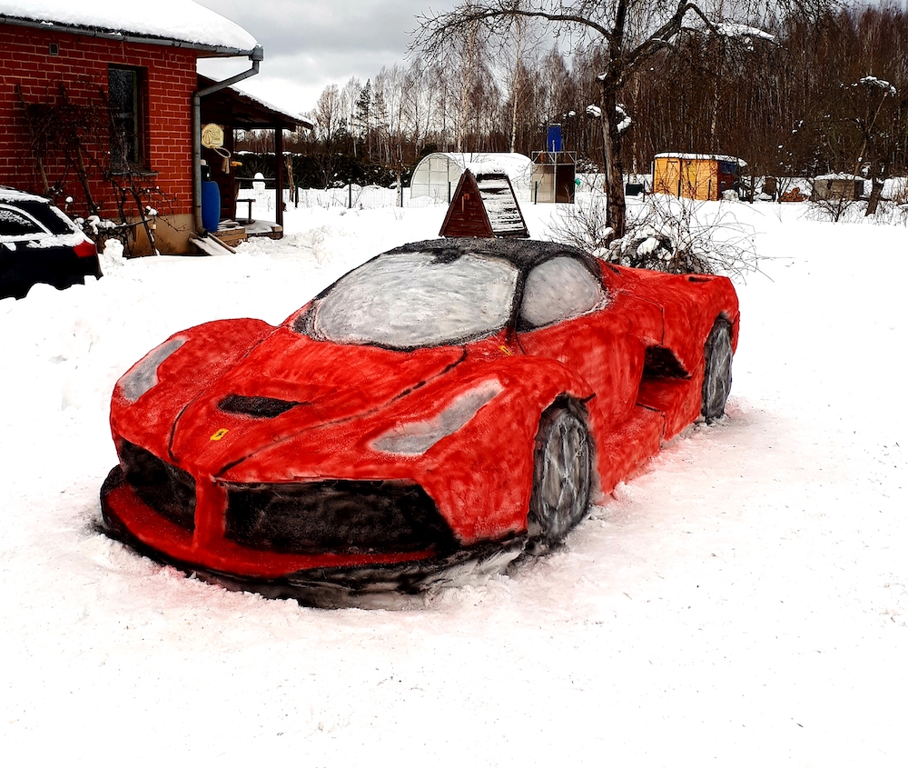 好想買跑車! 夫妻在前院雪雕「破億法拉利超跑」 網友膜拜:買不起就自己造!