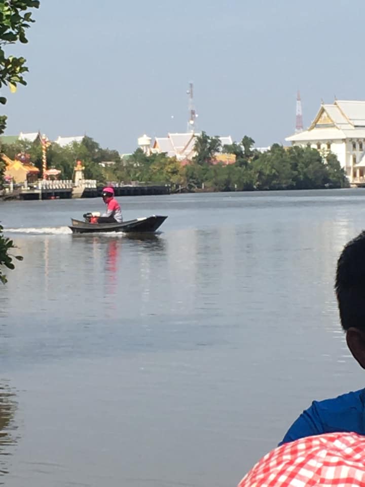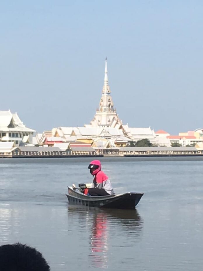▼這張照片是在北柳府的帕空河(Bang Pakong River)拍攝的,這條河距泰國曼谷約有1小時的車程。外送員穿著粉色外套,頭戴全罩式安全帽,在小船上努力划槳,應該是下機車後就換乘小船了。