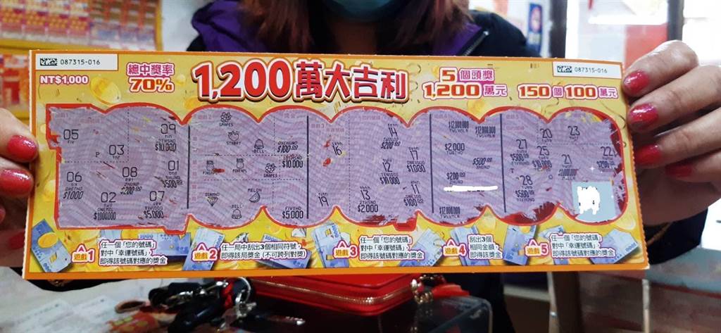 ▼她花1000元買「1200萬大吉利」,剛開始前3區都槓龜,沒想到刮到第4區時,發現3個相同密密麻麻的數字,仔細一看竟是8位數「12000000」,刮中了1,200萬元頭獎!她連忙詢問「大獎要去哪邊領?」彩券行老闆趕緊拍下刮刮樂中獎的照片,並在當天下午放鞭炮慶祝。