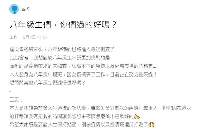▼原po以「八年級生們,你們過得好嗎」為題發文,表示八年級生幾乎都踏入社會了,對很多人來說,面對的挑戰有「疫情帶來的未知數、居高不下的房價以及金融市場的不穩定」等等。原po因為疫情失去工作,只能打起精神重新來過。他不知道其他的八年級生,都過得還好嗎?