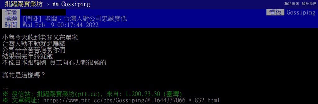 ▼這名網友以「老闆:台灣人對公司忠誠度低」為題發文,提到老闆不滿台灣員工動不動就離職,竟在辦公室開嗆台人沒忠誠度。老闆說「公司辛辛苦苦培養你們,結果領完年終就跑,不像日本跟韓國員工向心力都很強的」。