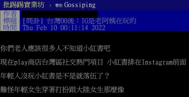 ▼這位網友以「台灣00後:IG是老阿姨在玩的」為題發文,說:「你們老人應該很多人不知道小紅書吧?」原po指出,目前Play商店台灣區社交熱門項目,小紅書已經排在IG前面,他提出疑問:「年輕人沒玩小紅書是不是就落伍了?難怪年輕女生穿著打扮跟大陸女生那麼像…」