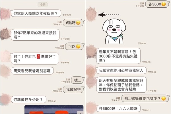 ▼這名男網友在臉書社團「爆怨公社」po文說,自己與女友剛剛交往2個月,農曆新年到來,女友要求他除夕年夜飯後去她家拜年,還提醒他包紅包。原po準備各包3600元,女友卻很不滿,訓斥說:「過年又不是喝喜酒!包3600你不覺得有點失禮嗎?我希望你能用心對待我的家人,明天有很多親戚會來我家拜年,你做點面子給我爸媽,對我們以後也有幫助!」
