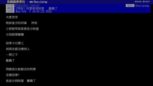▼原po表示,先前有聽到一名同事說家族正在分遺產,還說「分到就要離職」。沒想到春節假期結束後,開工日當天就沒有看到這名同事,一問之下才知道對方已經離職。原po詢問其他同事後,得知這名同事是高雄人,順利分到一間房和2000萬現金後就離職了。原po不禁好奇:「只有2000萬,活的下來?」