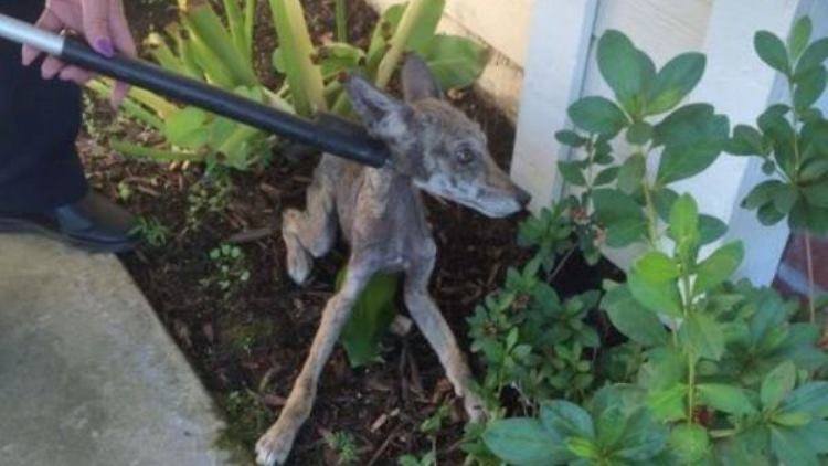 ▼救援人員把牠從角落抓出來時,才發現牠根本不是狗,而是一隻野生的土狼!