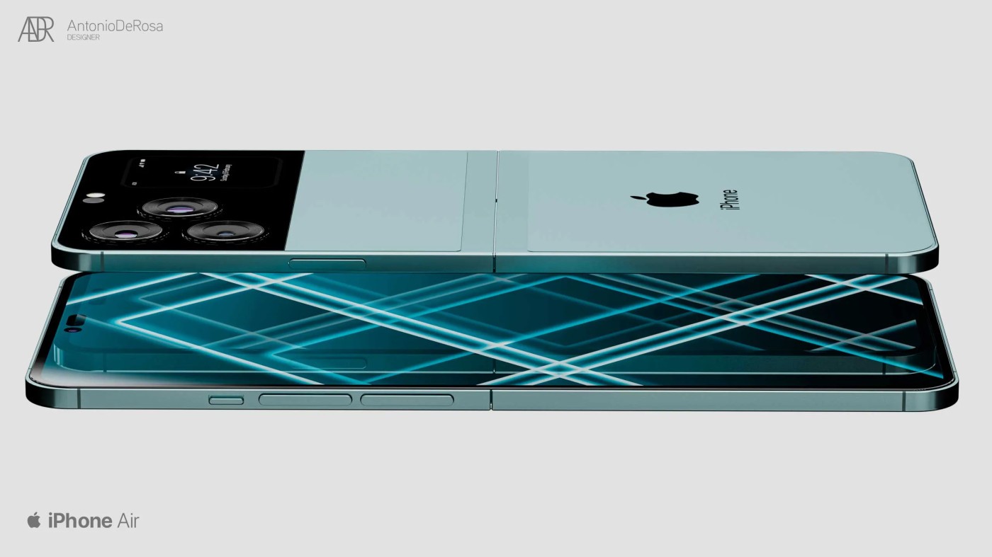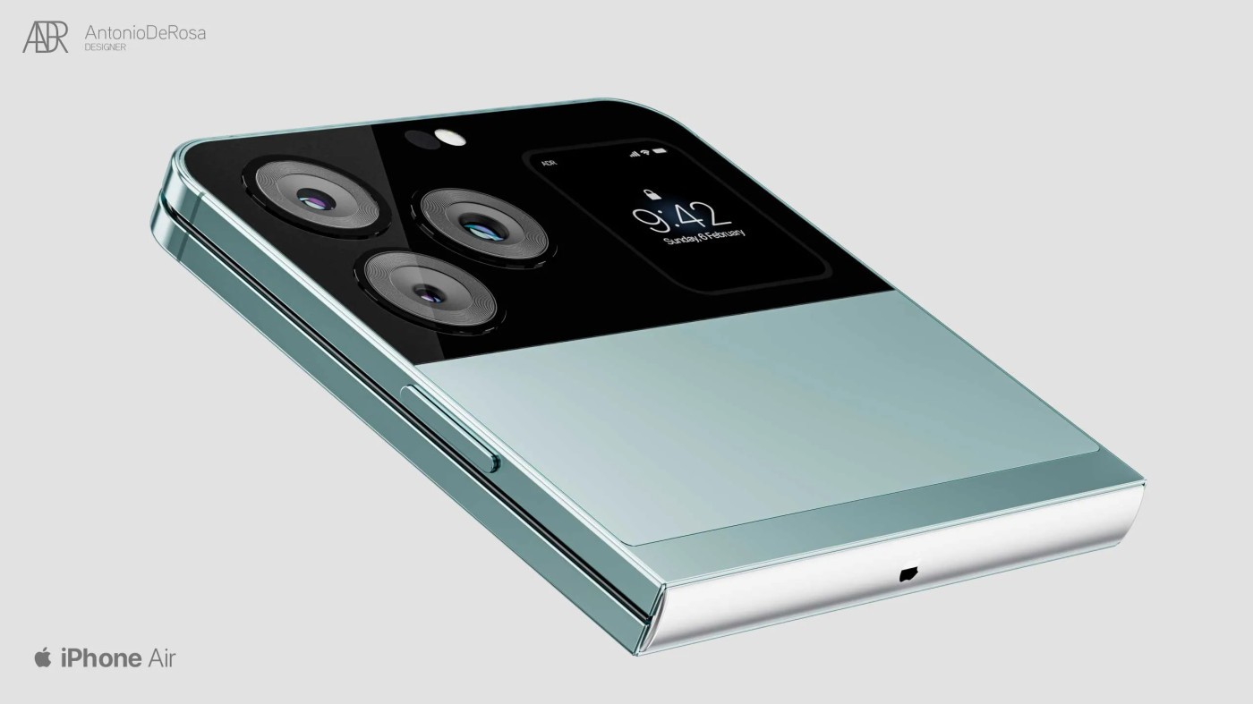 ▼報導中說,iPhone Air的設計概念來自設計師Antonia De Rosa。根據概念圖,這款手機的摺疊部分採用鍍鉻鉸鏈,後置有三鏡頭排列,分別為廣角鏡頭、超廣角鏡頭、長焦鏡頭。主鏡頭排列與機身背板貼平,沒有凸出。