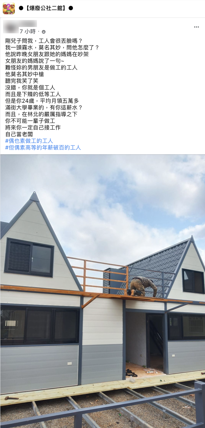 2022年02月22日職業不分貴賤,但總有一些人心存偏見。日前一名男網友在臉書社團「爆廢公社二館」發文說,兒子在工地上班,每個月能領5萬多元,但兒子女友的媽媽卻看不起做工行業。兒子因此感到自卑,甚至問「工人會很丟臉嗎?」原po的一句話幫兒子解開心結。